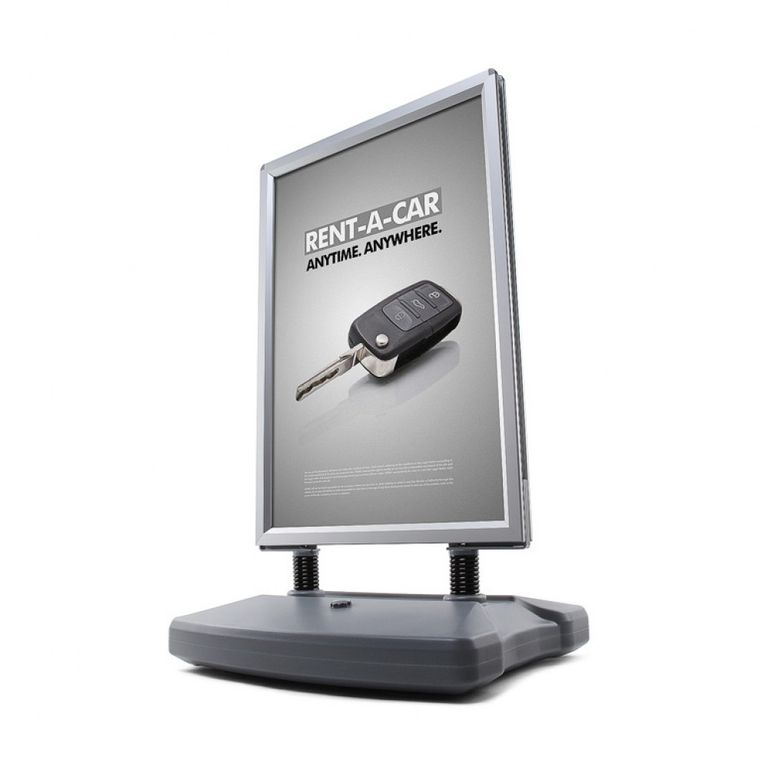 Speziell für Ihre Werbung in windigen Bereichen ist der Kundenstopper WINDTALKER® von wdm-scherl in Schwandorf, Regensburg, Nürnberg, Erlangen, Weiden und Amberg die optimale Lösung. Sein mit Wasser oder Sand befüllbarer Standfuß bietet in Verbindung mit den Spezialfedern aus Stahl eine hohe Standfestigkeit. Für den einfachen Transport sind im Standfuß Rollen integriert. So können Sie den Kundenstopper trotz des Standgewichtes einfach bewegen. Der Aluminium-Schnellwechselrahmen kann doppelseitig mit Plakaten bestückt werden und garantiert Ihnen auch bei hohen Windstärken eine auffällige Werbemöglichkeit.